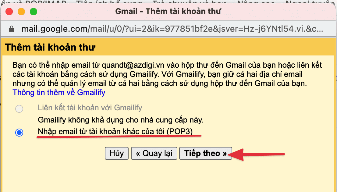 Tiếp theo bạn chọn POP3 sau đó click Tiếp theo.