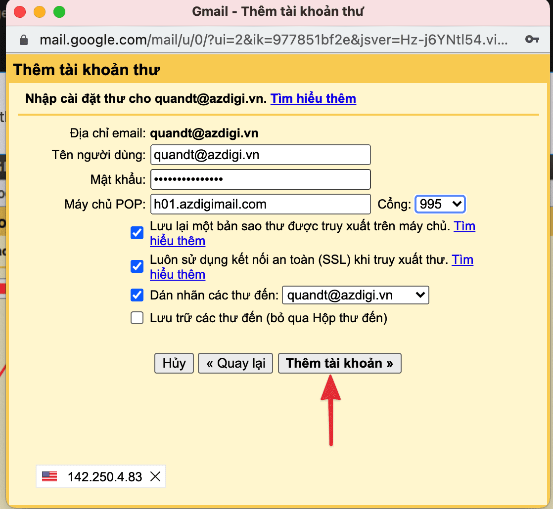 Sau đó bạn hãy nhập các thông tin tài khoản, mật khẩu và máy chủ POP vào. Mình sẽ chú thích một số thông tin bên dưới để bạn đăng nhập khi sử dụng Email Hosting tại AZDIGI.