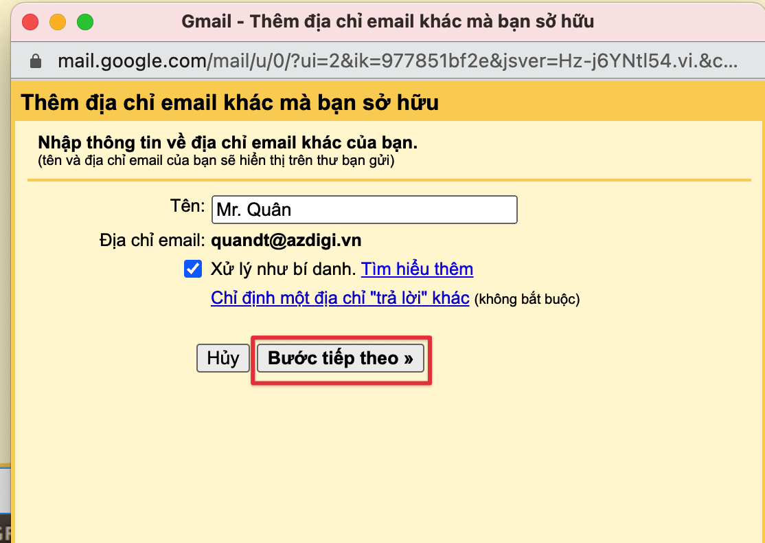 Nhập tên hiển thị khi gửi mail và click Bước tiếp theo để thiết lập.