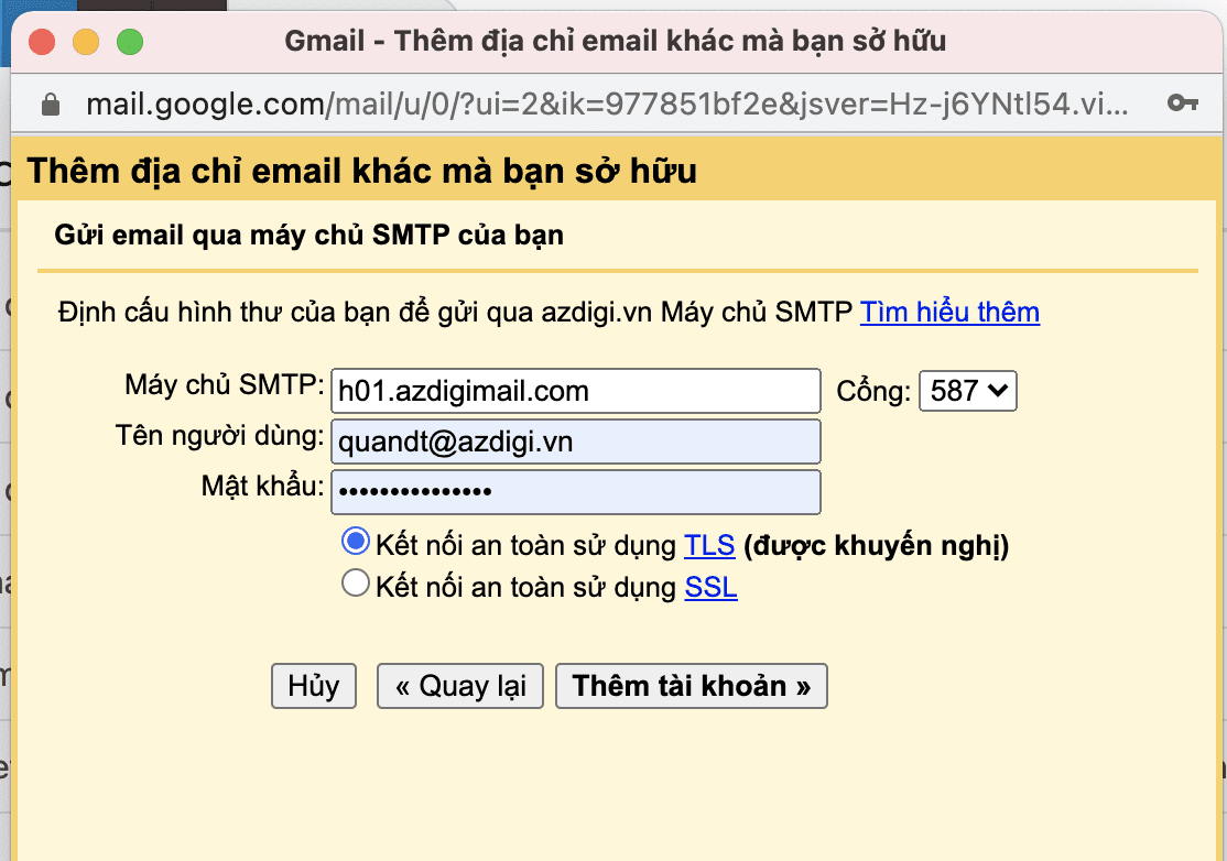 • Máy chủ SMTP: h01.azdigimail.com (Thông số mặc định khi sử dụng Email Hosting AZDIGI)
