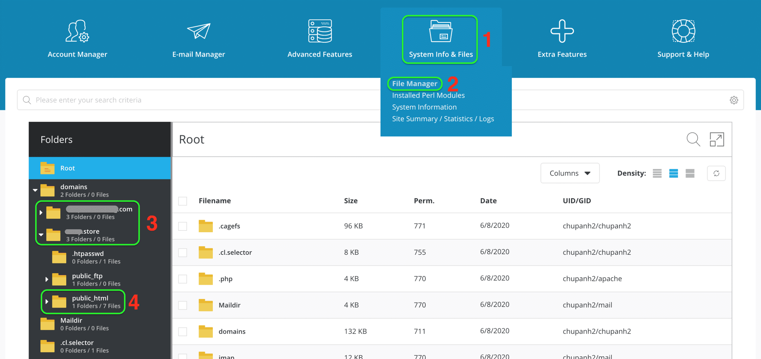 Sau khi khởi tạo hệ thống cũng đồng thời tạo một thư mục tương ứng với tên domain của bạn vừa tạo, bạn truy cập System Info & Files(số 1) > File Manager(số 2) tương tự như hình bên dưới để xem nhé.