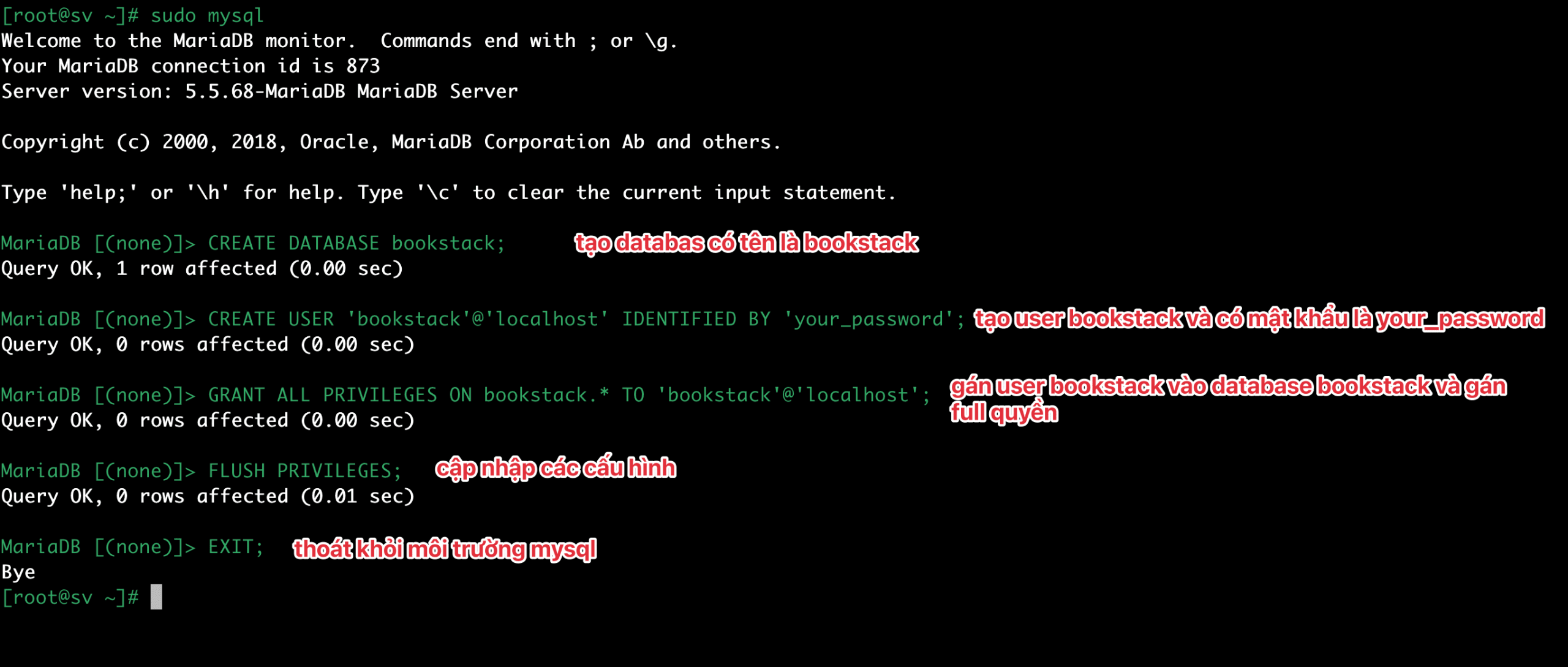 Sau đó, chạy các lệnh sau trong MySQL để tạo cơ sở dữ liệu và người dùng mới. Và nhớ thay your_password thành mật khẩu bạn đặt