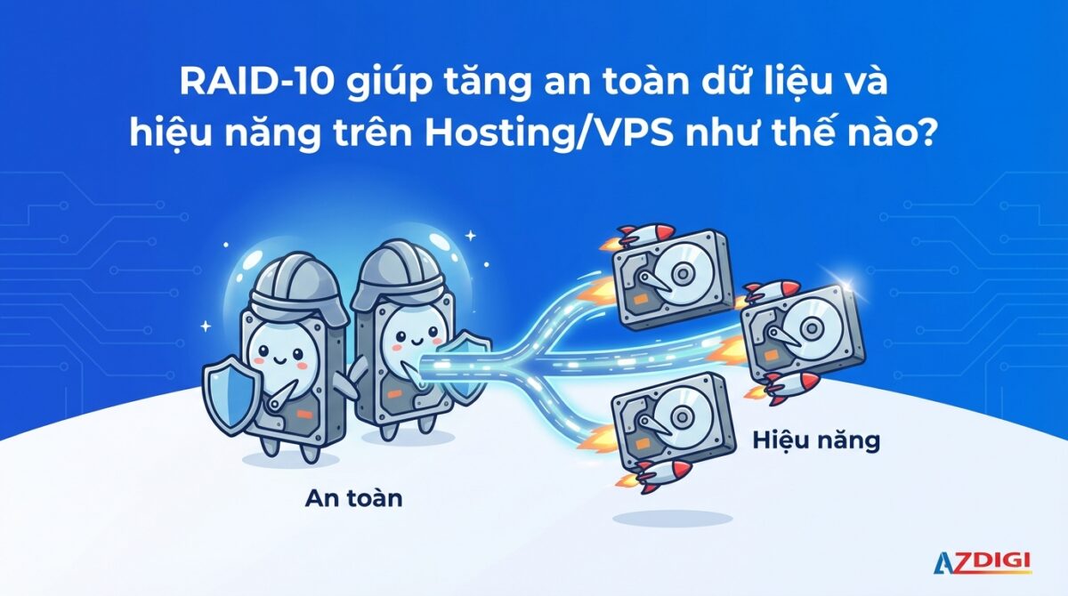 Cấu hình RAID là một trong những giải pháp tiêu chuẩn được sử dụng rộng rãi trong lĩnh vực máy chủ lưu trữ để tăng độ tin cậy và hiệu suất lưu trữ. Trong các cấp độ RAID khác nhau, RAID 10 nổi bật vì cân bằng tốt giữa an toàn dữ liệu và hiệu năng. Trong bài viết này, AZDIGI sẽ đi sâu vào phân tích RAID 10 để tìm hiểu cách hoạt động, từ đó hiểu được vì sao tìm chọn các dịch vụ Hosting/VPS được thiết lập RAID-10 là rất quan trọng để bảo vệ dữ liệu.