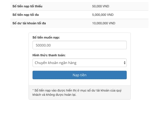 Sau đó các bạn nhập số tiền cần nạp (tối thiểu 200.000 đồng) và chọn hình thức thanh toán phù hợp.