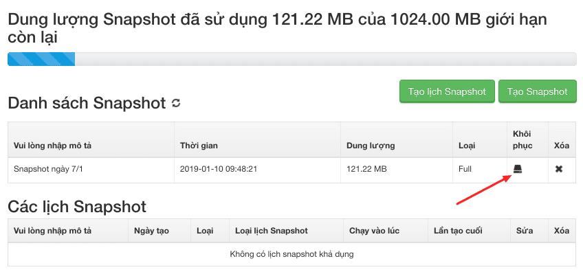 Trường hợp bạn cần khôi phục lại dữ liệu máy chủ về thời điểm chụp Snapshot nào đó thì có thể chọn nút khôi phục ở bản snapshot cần khôi phục ngay trong danh sách.