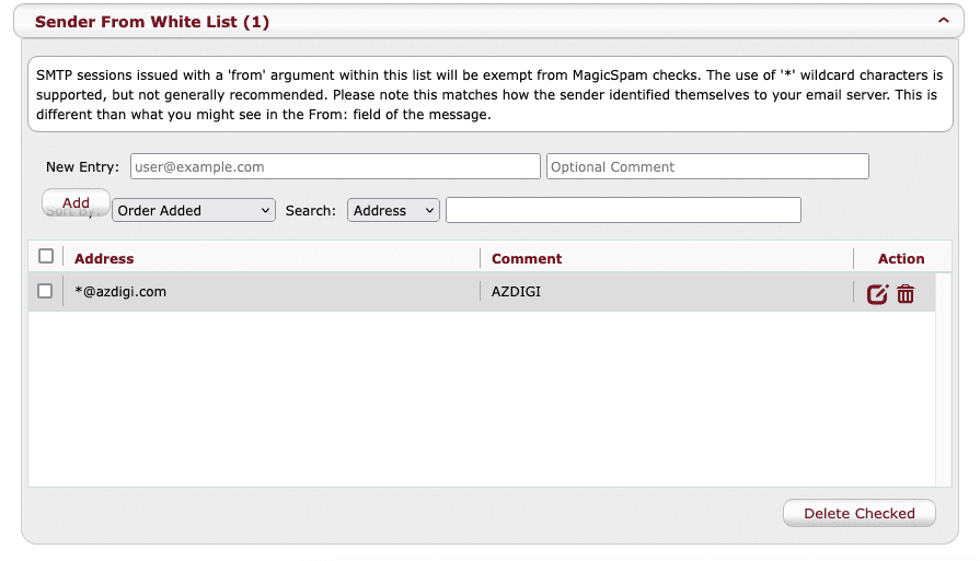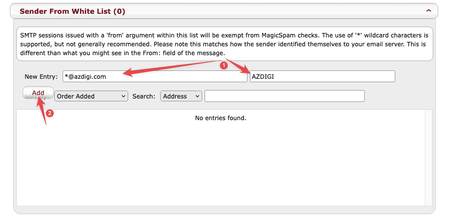 - Thêm theo tên miền: Để thêm tất cả email theo tên miền bạn nhập như sau *@domain (VD: *@azdigi.com tất cả email thuộc đuôi @azdigi.com sẽ được vào danh sách trắng, bỏ qua bộ lọc spam trên MagicSpam)
