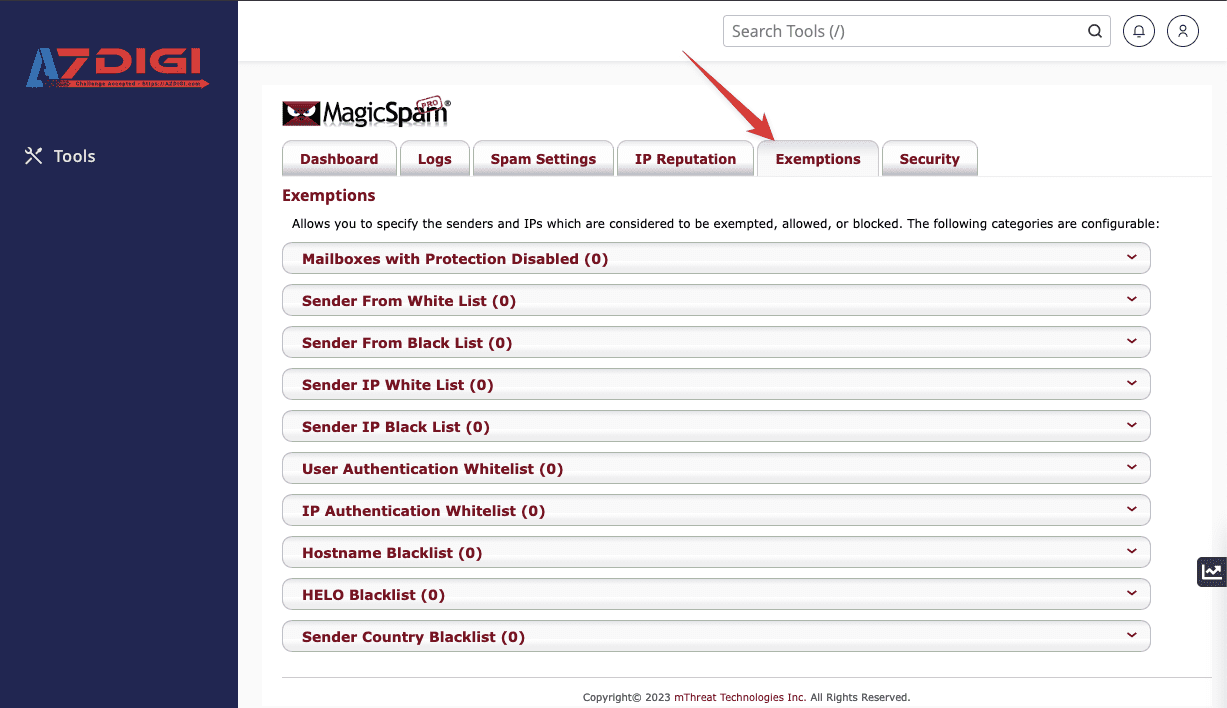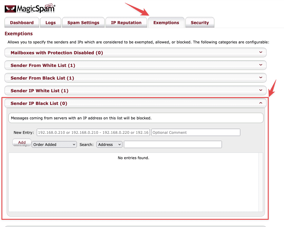 Trong giao diện menu Exemptions, bạn chọn mục Sender IP Black List.