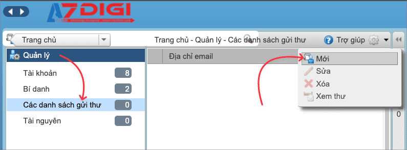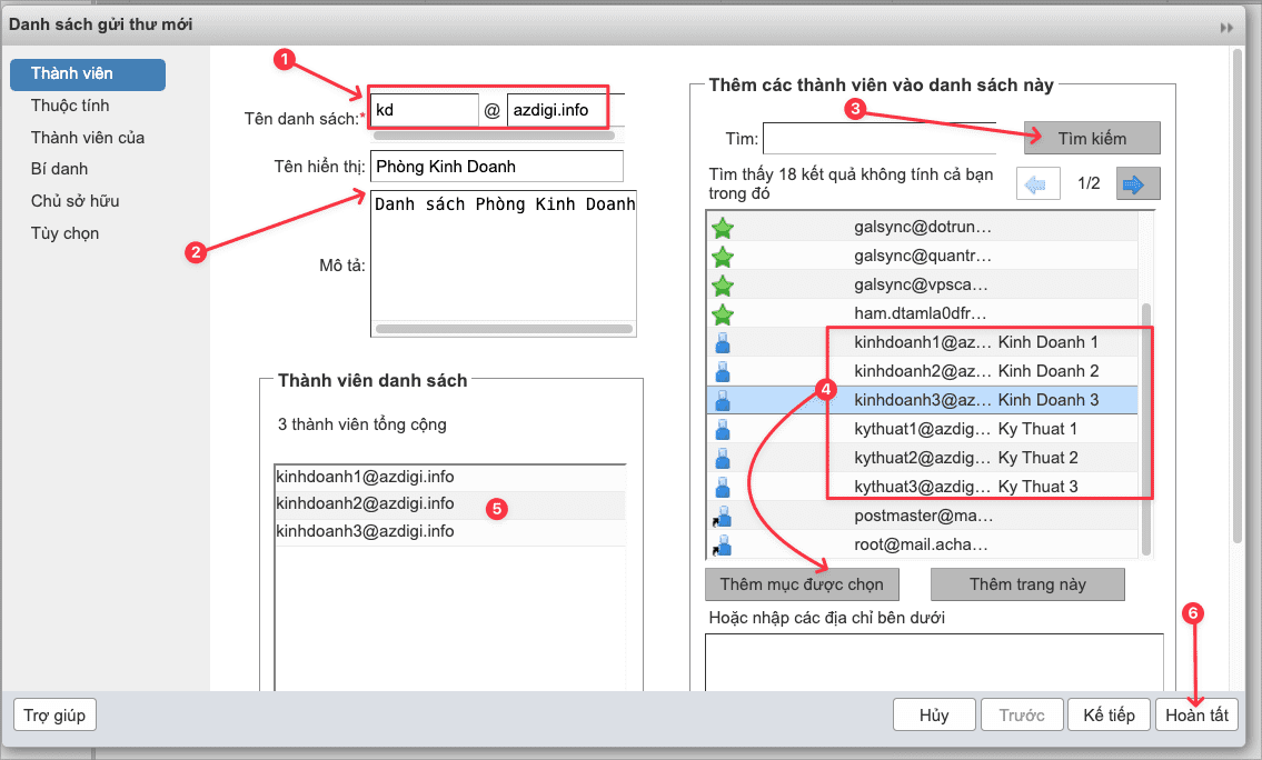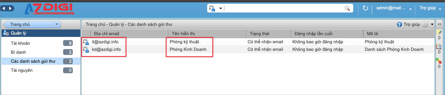 - Tên danh sách: Bạn nhập vào tên đại diện của danh sách mail. Ở đây tôi ví dụ là kd@azdigi.info và sẽ thêm tất cả các mail của phòng kinh doanh vào.