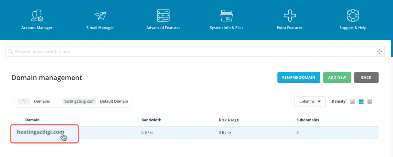 Để thay đổi IP cho tên miền phụ của gói host thì bạn cũng làm như trên. Nghĩa là đầu tiên bạn cần truy cập vào Account Manager => Domain Setup và ấn nút ADD NEW để thêm tên miền vào. Sau đó thực hiện lại các bước như trên.