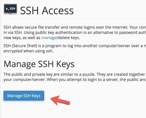 Trước tiên bạn cần phải thêm key của bạn đã có sẵn hoặc tạo mới một key dành riêng cho việc truy cập này. Bạn vào cPanel và tìm đến mục Security => SSH Access.