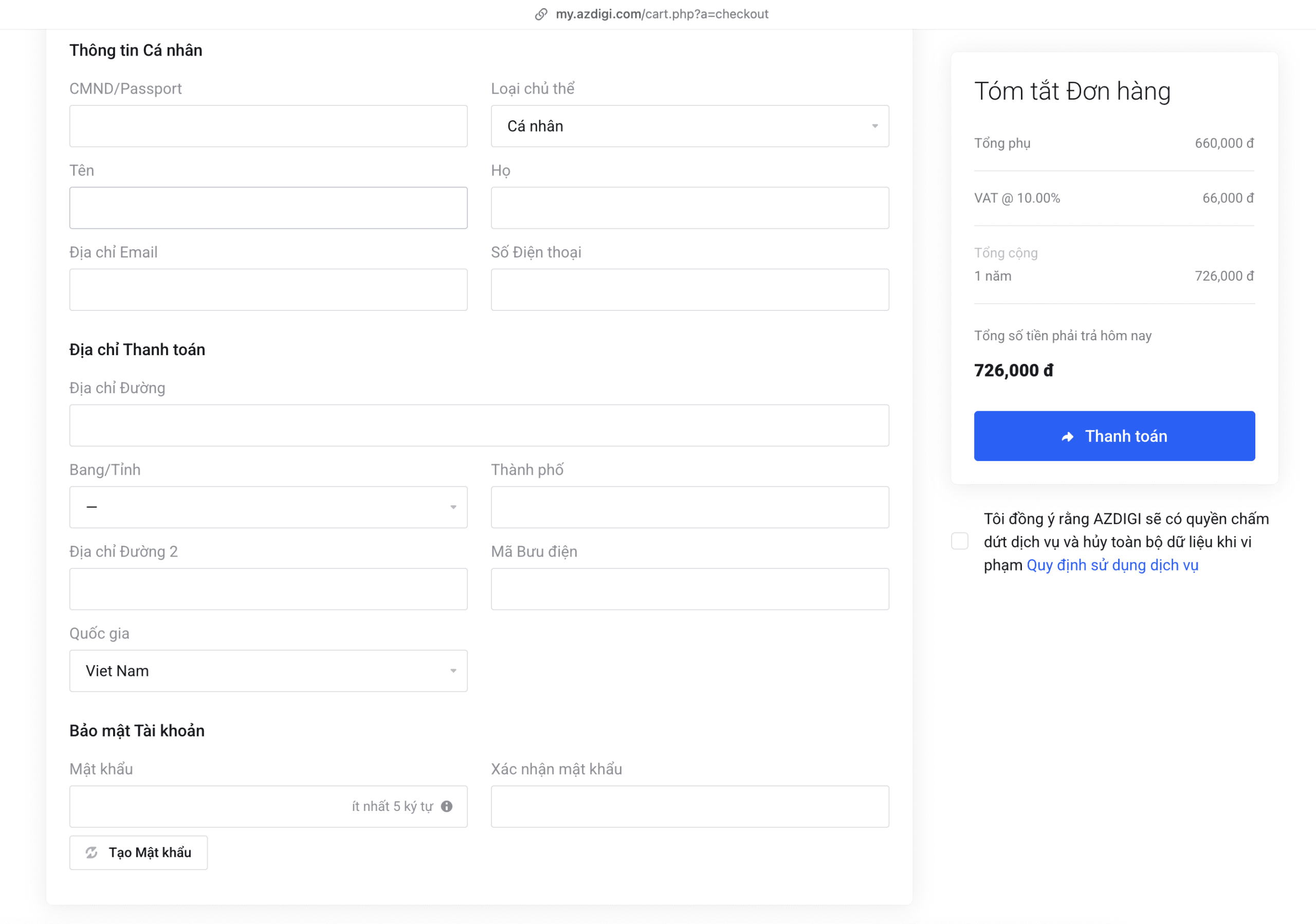 Hoặc có thể khởi tạo tài khoản khách hàng trực tiếp mà không cần đăng ký dịch vụ thông qua liên kết https://my.azdigi.com/register.php