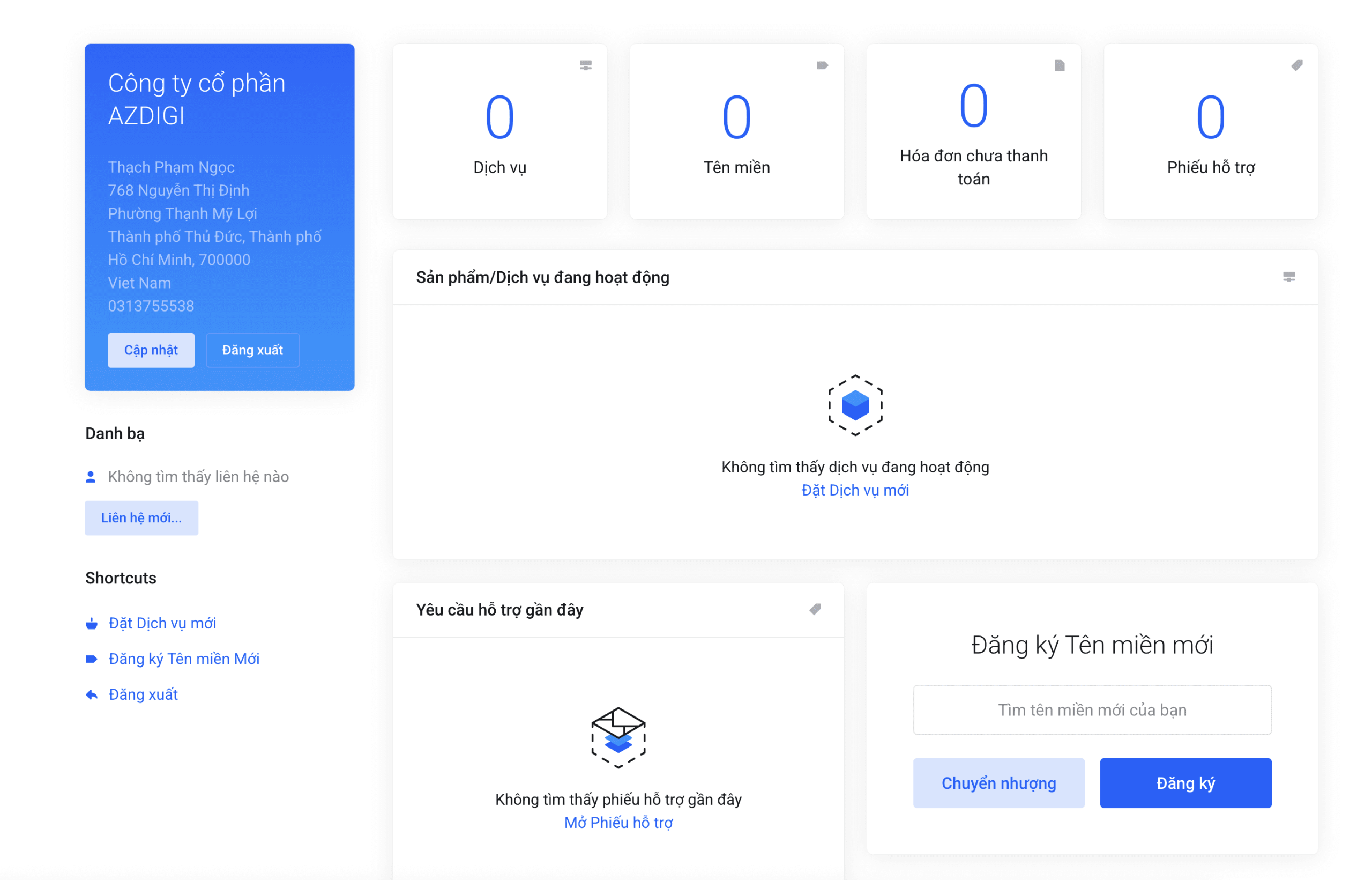 Khi đăng ký và sử dụng các dịch vụ tại AZDIGI, khách hàng sẽ quản lý và theo dõi, gửi yêu cầu hỗ trợ thông qua trang quản lý dịch vụ tại địa chỉ https://my.azdigi.com. Và mỗi tài khoản khách hàng sẽ có thông tin đại diện mà AZDIGI sẽ sử dụng thông tin đó để xuất hóa đơn giá trị gia tăng (VAT).