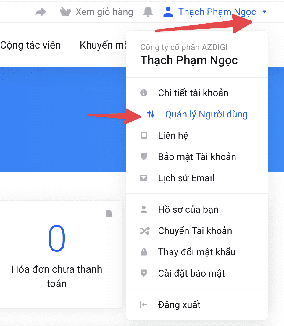 Để thêm một tài khoản người dùng mới vào tài khoản khách hàng, bạn có thể truy cập vào nút quản lý tài khoản (nhấp vào tên người dùng ở góc phải phía trên màn hình) và truy cập vào Quản lý người dùng.