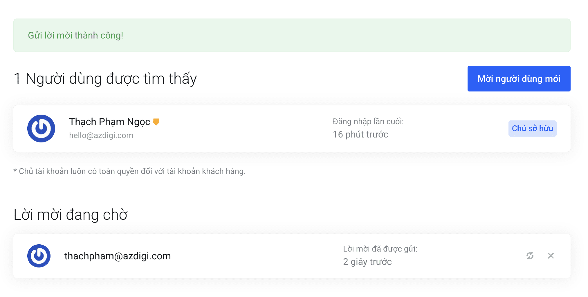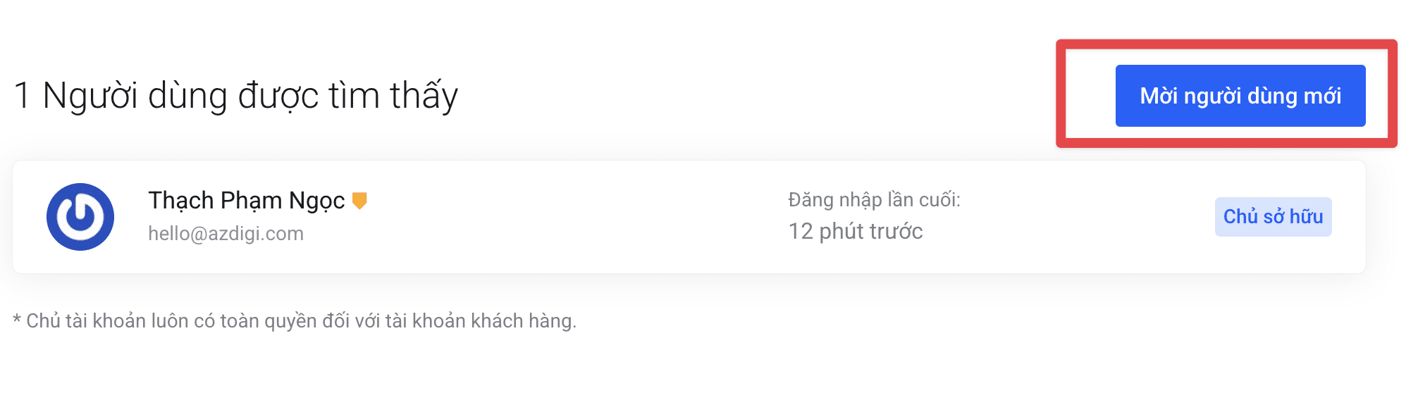 Mặc định khi khởi tạo, mỗi tài khoản khách hàng sẽ có một người dùng chủ sở hữu (thông tin đăng nhập) trùng với địa chỉ email khởi tạo, mỗi tài khoản có thể thêm nhiều người dùng khác nhau và mỗi người dùng cũng có thể quản lý nhiều tài khoản khách hàng khác nhau tại AZDIGI.