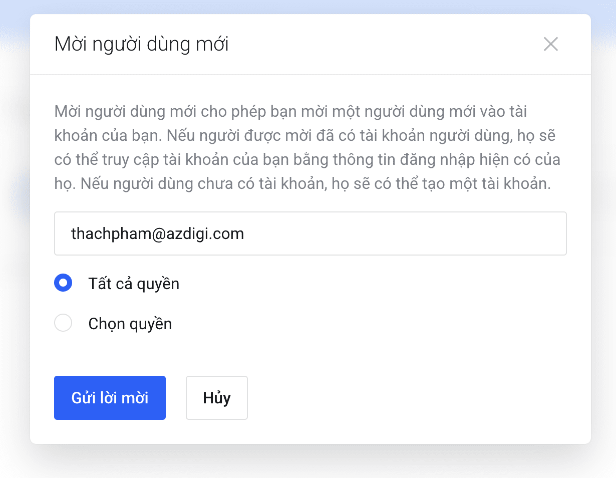 Tại giao diện thêm người dùng, bạn nhập địa chỉ email của người dùng cần truy cập quản lý, nếu email được mời chưa có tài khoản người dùng tại AZDIGI thì hệ thống sẽ gửi email yêu cầu khởi tạo cho người dùng đó, nếu email đã tồn tại trong hệ thống AZDIGI thì người dùng sẽ được thông báo và có thể truy cập vào.