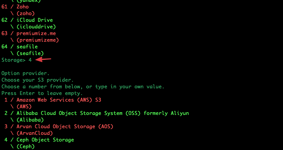 • Chọn loại lưu trữ: Nhập số tương ứng với Amazon S3 Compliant Storage Providers (Ở phiên bản rclone v1.70.3 tương ứng số 4)