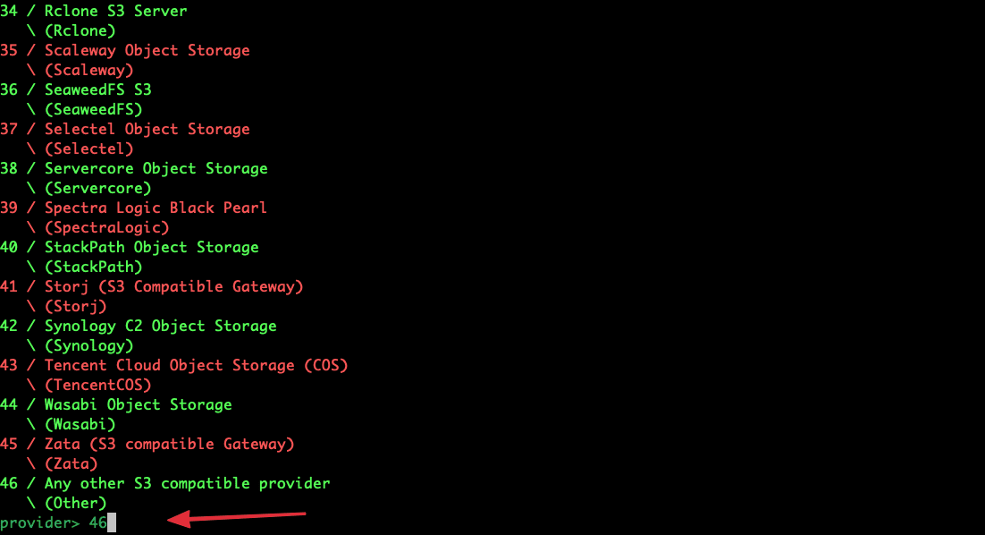 Sau khi chọn xong. Sẽ xuất hiện tiếp các đơn vị S3 (Choose your S3 provider.). Bạn tìm và chọn vào Any other S3 compatible provider (Other) nếu dùng tại AZDIGI.