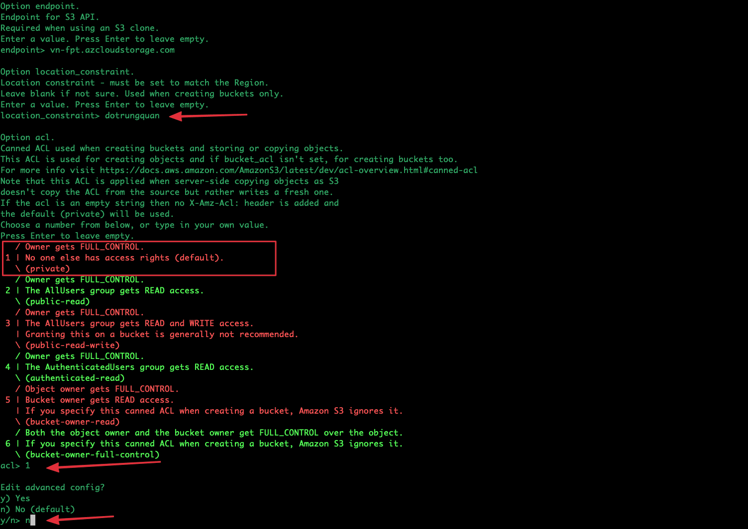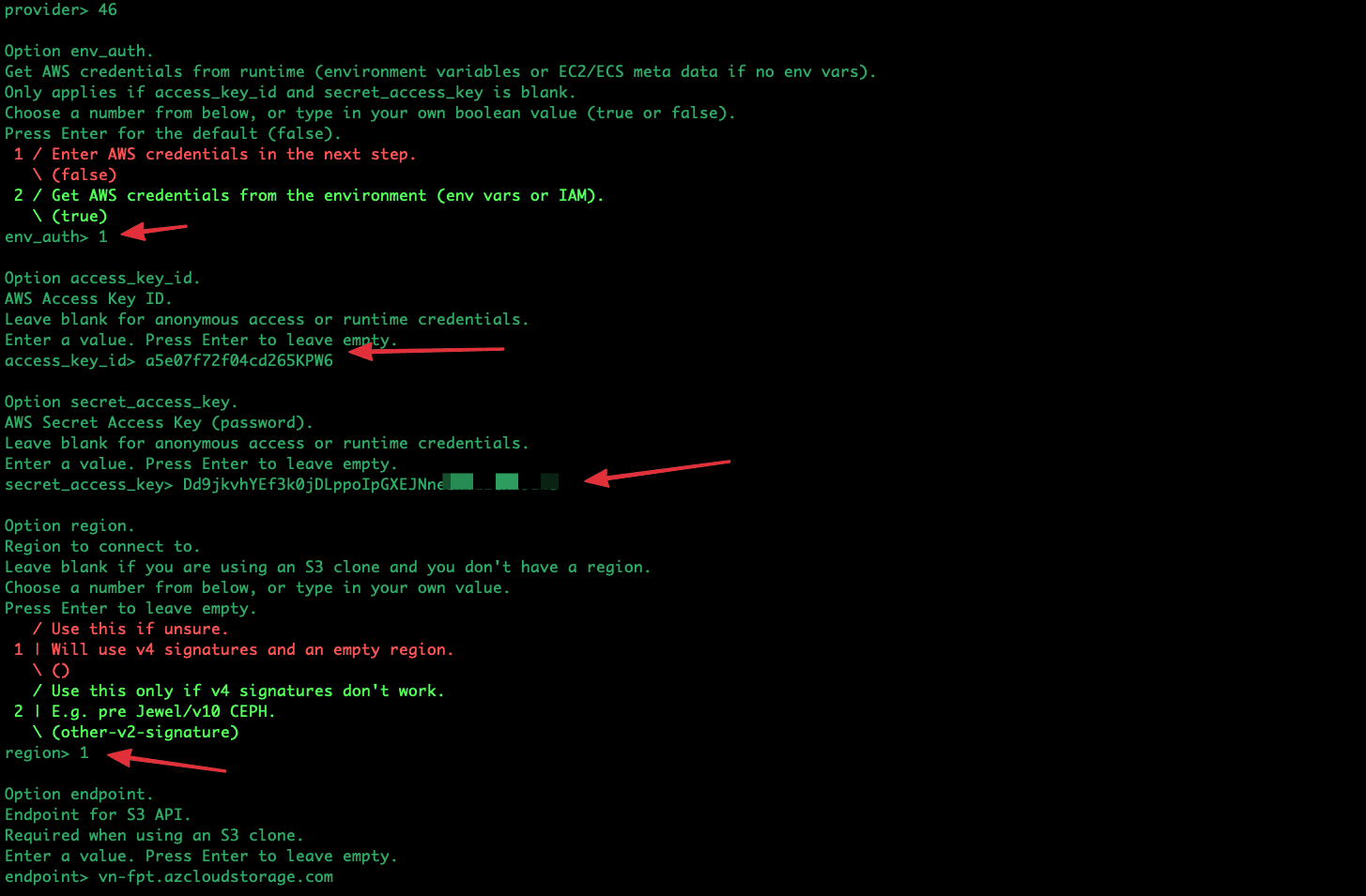 Tiếp theo ở bảng Option env_auth bạn chọn vào 1 / Enter AWS credentials in the next step. (false). Và nhập tiếp vào các thông tin bao gồm: