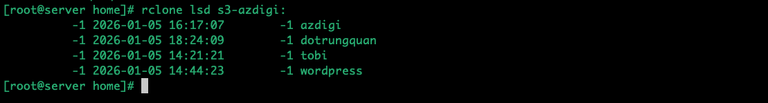 Thay s3-azdigi bằng tên remote bạn đã đặt. Nếu thành công, bạn sẽ thấy danh sách các bucket trong tài khoản S3 của mình.