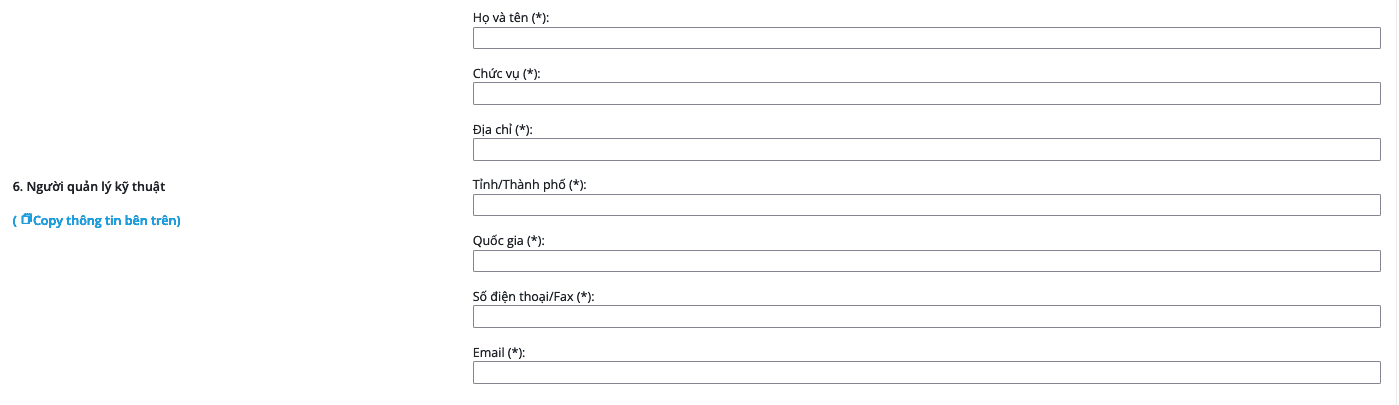 Mục 6 quý khách vui lòng điền đầy đủ thông tin người quản lý kỹ thuật hoặc nếu thông tin giống với mục số 5 quý khách có thể nhấn vào mục Copy thông tin bên trên để hệ thống nhập thông tin tự động.