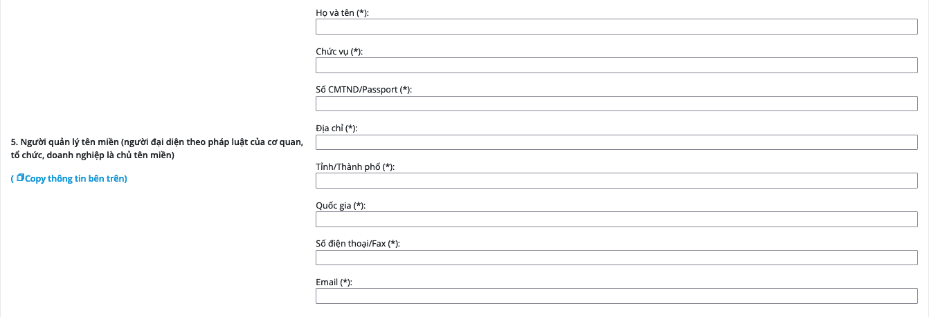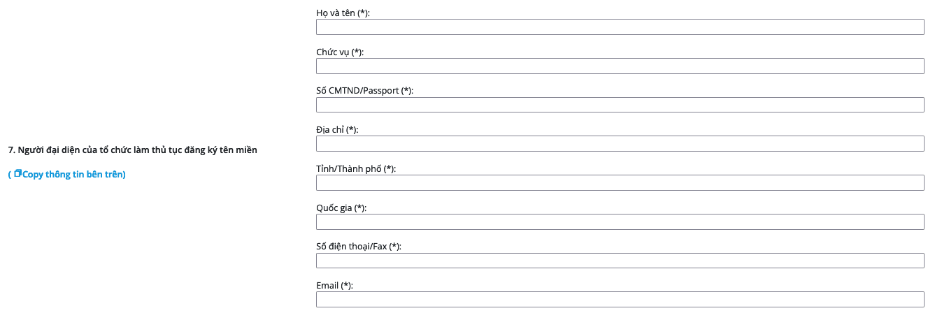 Mục 7 điền thông tin người đại diện của tố chức làm thủ tục đăng ký tên miền nếu thông tin giống với mục số 6 quý khách có thể nhấn vào mục Copy thông tin bên trên để hệ thống nhập thông tin tự động.