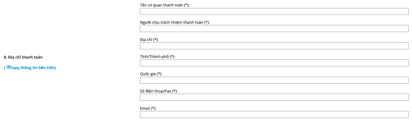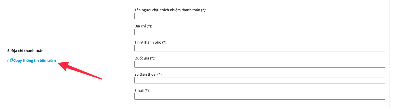 Mục số 5 thông tin chủ thể thanh toán , điền tương tự mục 4 nếu thông tin giống với mục số 4 quý khách có thế nhấn vào mục Copy thông tin bên trên để hệ thống tự động lấy thông tin mục số 4 điền vào .