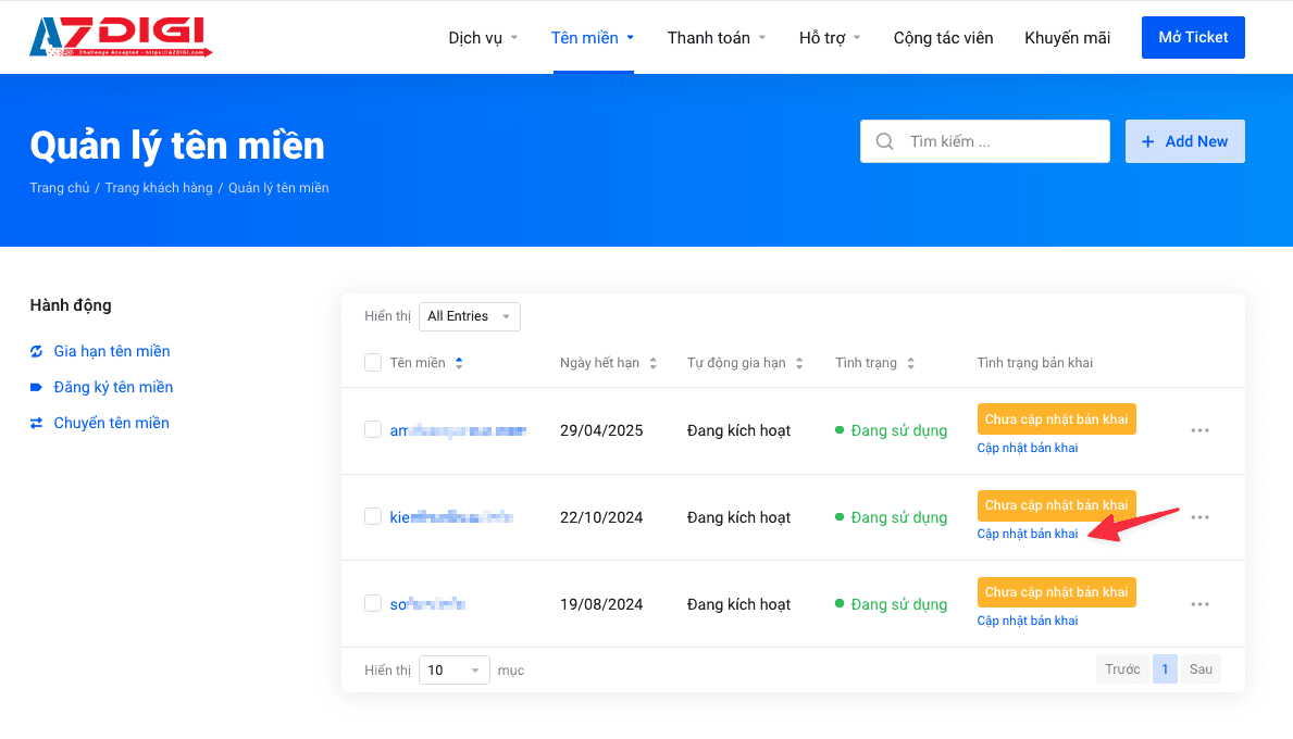 Quý khách vui lòng truy cập vào trang quản lý dịch vụ my.azdigi.com đăng nhập bằng tài khoản dịch vụ đã đăng ký tìm đến mục Tên miền chọn Quản lý tên miền.