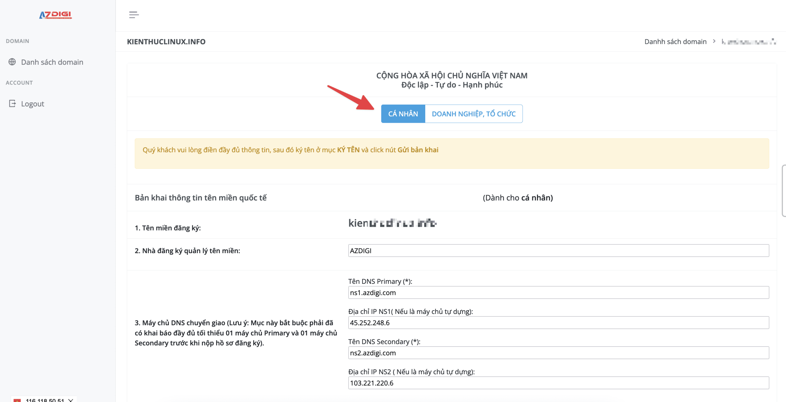 Để tên miền hoạt động bình thường không bị khoá gây gián đoạn hoạt động dịch vụ do thiếu hồ sơ bản khai. Sau khi quý khách đăng ký dịch vụ tên miền hoặc tranfer tên miền về AZDIGI thành công, trong vòng thời hạn 3 ngày quý khách cần thực hiện hoàn thiện nộp hồ sơ bản khai tên miền.
