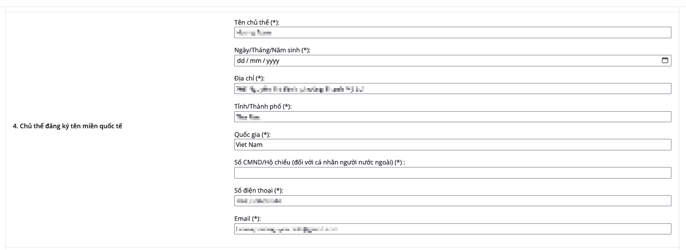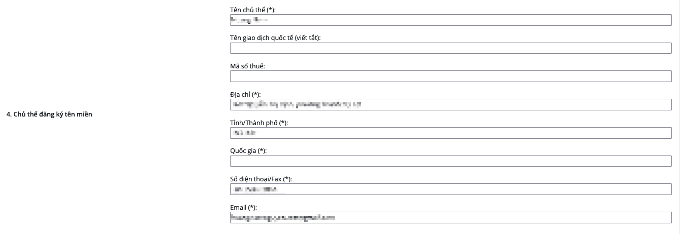 Mục số 4 điền thông tin chủ thể đăng ký sở hữu tên miền quý khách vui lòng điền đầy đủ các trường thông tin (*) không được phép để trống và điền thông tin có dấu đầy đủ.