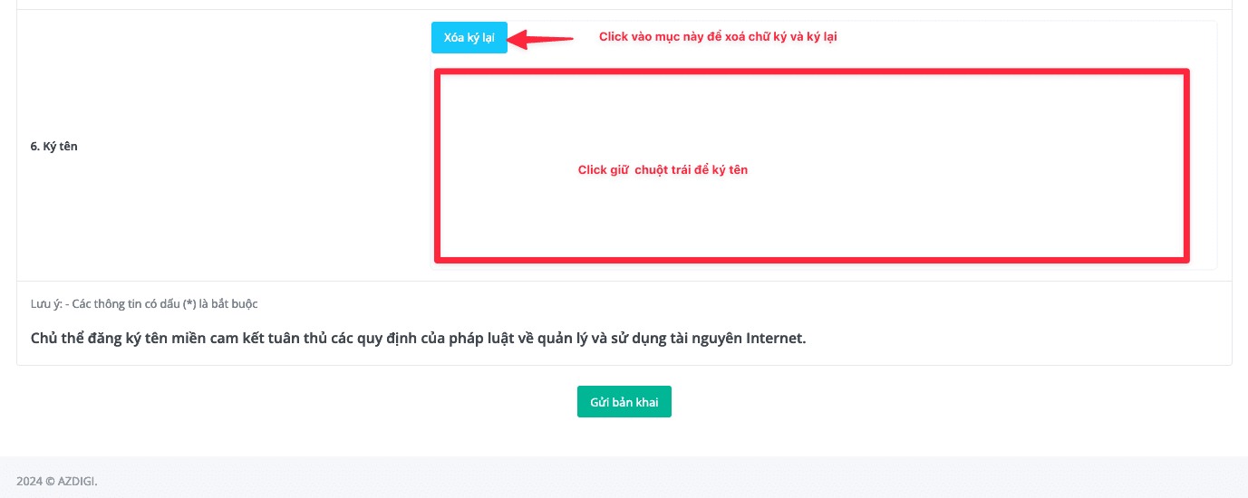 Mục 6 ký tên điện tử quý khách có thể click chuột trái vào phần khoản trắng để ký tên . Nếu quý khách ký sai có thể chọn chọn vào mục Xoá ký lại để thực hiện ký lại.