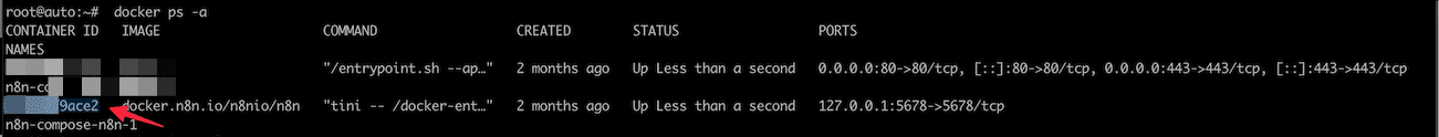 Trước tiên bạn phải thực hiện SSH vào VPS n8n, sau đó xác định Container ID của docker chạy n8n có id là gì qua lệnh docker ps -a, và ID của container chạy n8n là 650***f9ace2.