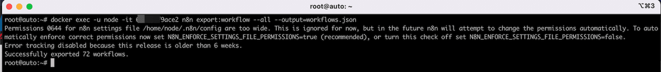 docker exec -u node -it 650***f9ace2 n8n export:workflow --all --output=workflows.json
