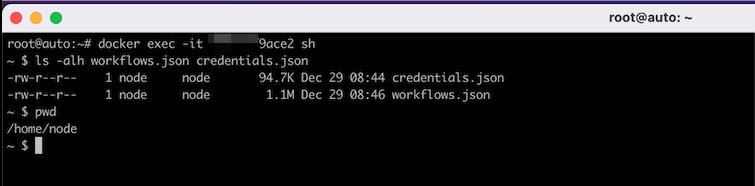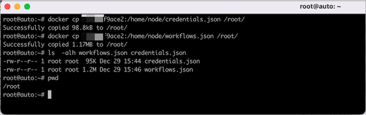 root@auto:~# docker cp 650***f9ace2:/home/node/workflows.json /root/