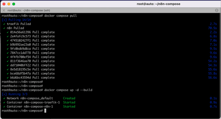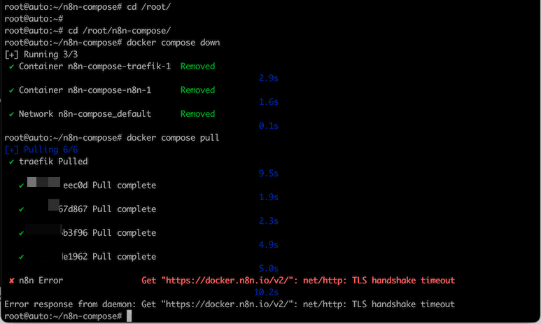 Nếu trong quá trình chạy lệnh docker compose pull để kéo image n8n mới về mà gặp lỗi net/http: TLS handshake timeout , bạn có thể chờ trong 5 – 10 phút và thực hiện lại lệnh trên.