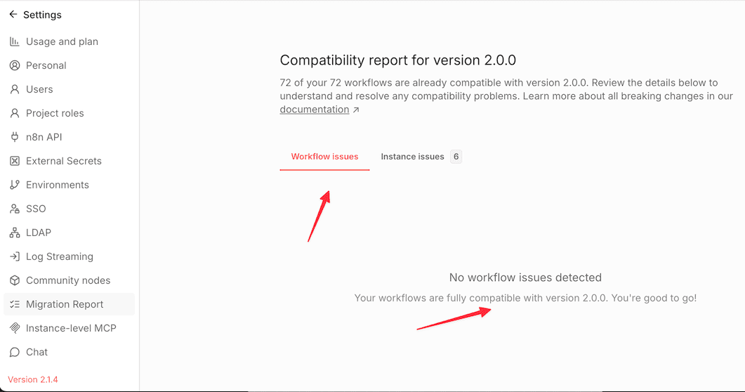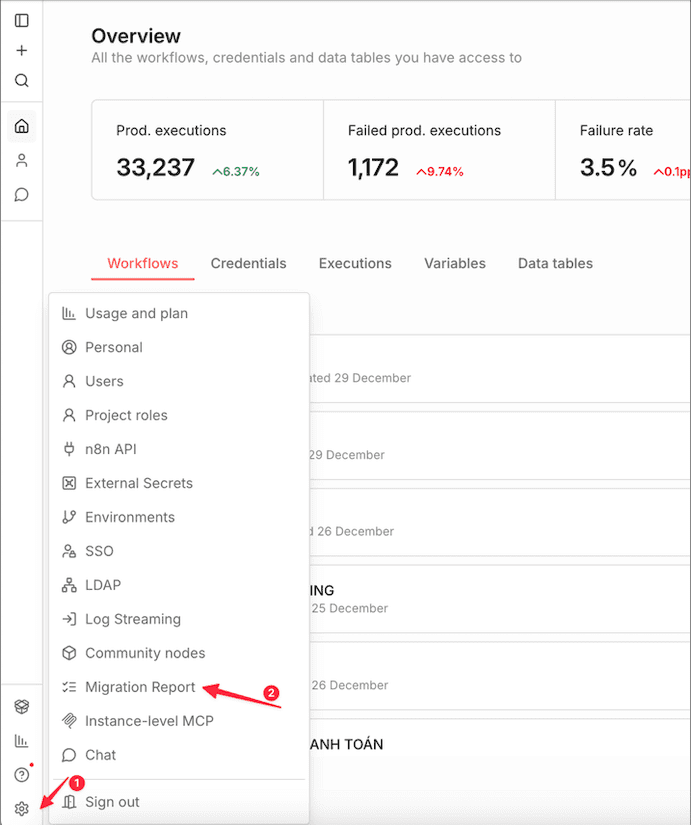 Và Chọn vào biểu tượng bánh răng (Settings) –> Migration Report –> Workflow issues, để kiểm tra Workflow có tương thích với phiên bản n8n không.