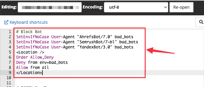 Lưu ý: Nếu bạn muốn thêm Bot vào danh sách chặn, thì bạn chỉ cần thêm dòng SetEnvIfNoCase User-Agent “tên_bot” bad_bots là được.