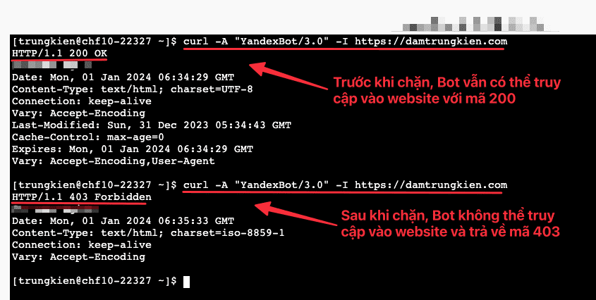 Để kiểm tra xem Bot đã được chặn thành công hay chưa, bạn có thể kiểm tra access_log của website. Nếu thấy mã trả về là 403 như log bên dưới là đã chặn thành công.