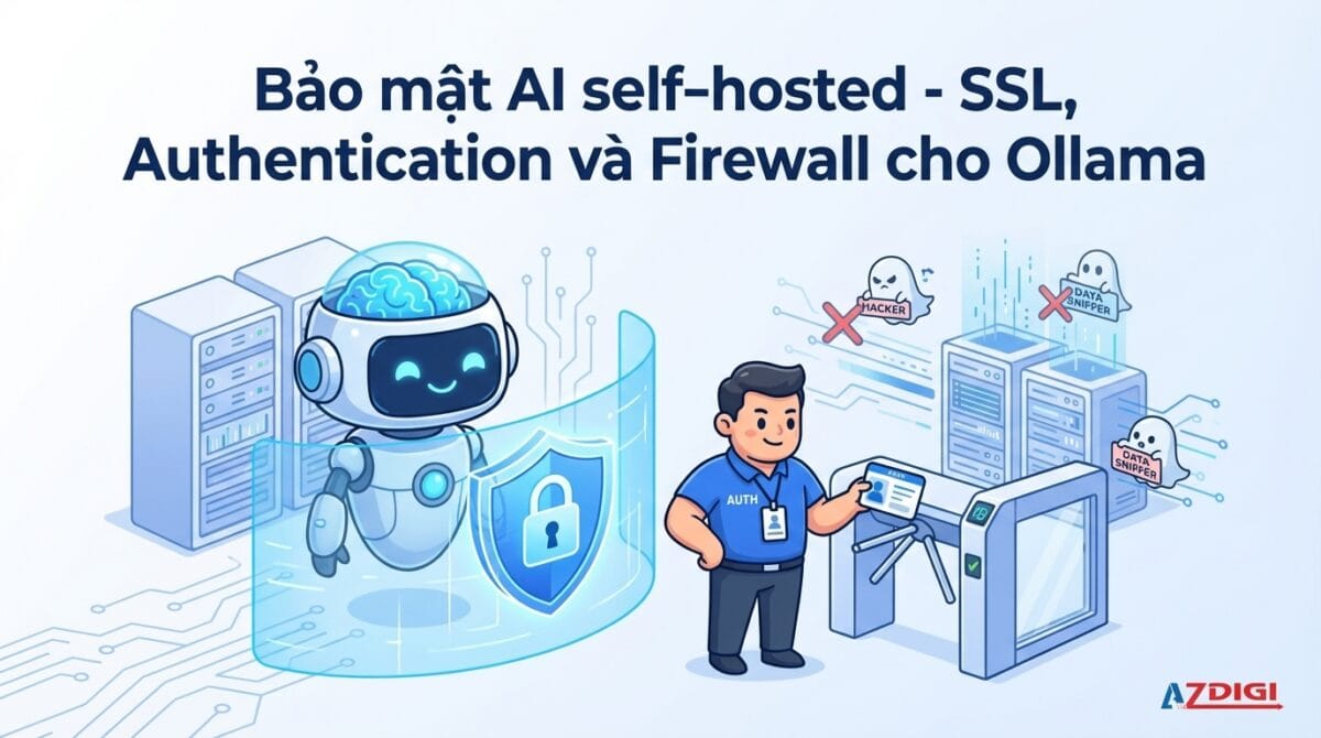 Mặc định, Ollama lắng nghe trên port 11434 và không có bất kỳ lớp xác thực nào. Ai biết IP của bạn, người đó dùng được. Bài này mình sẽ đi qua từng bước để khóa chặt server AI của bạn lại, từ firewall, reverse proxy với SSL, cho tới authentication và network isolation.