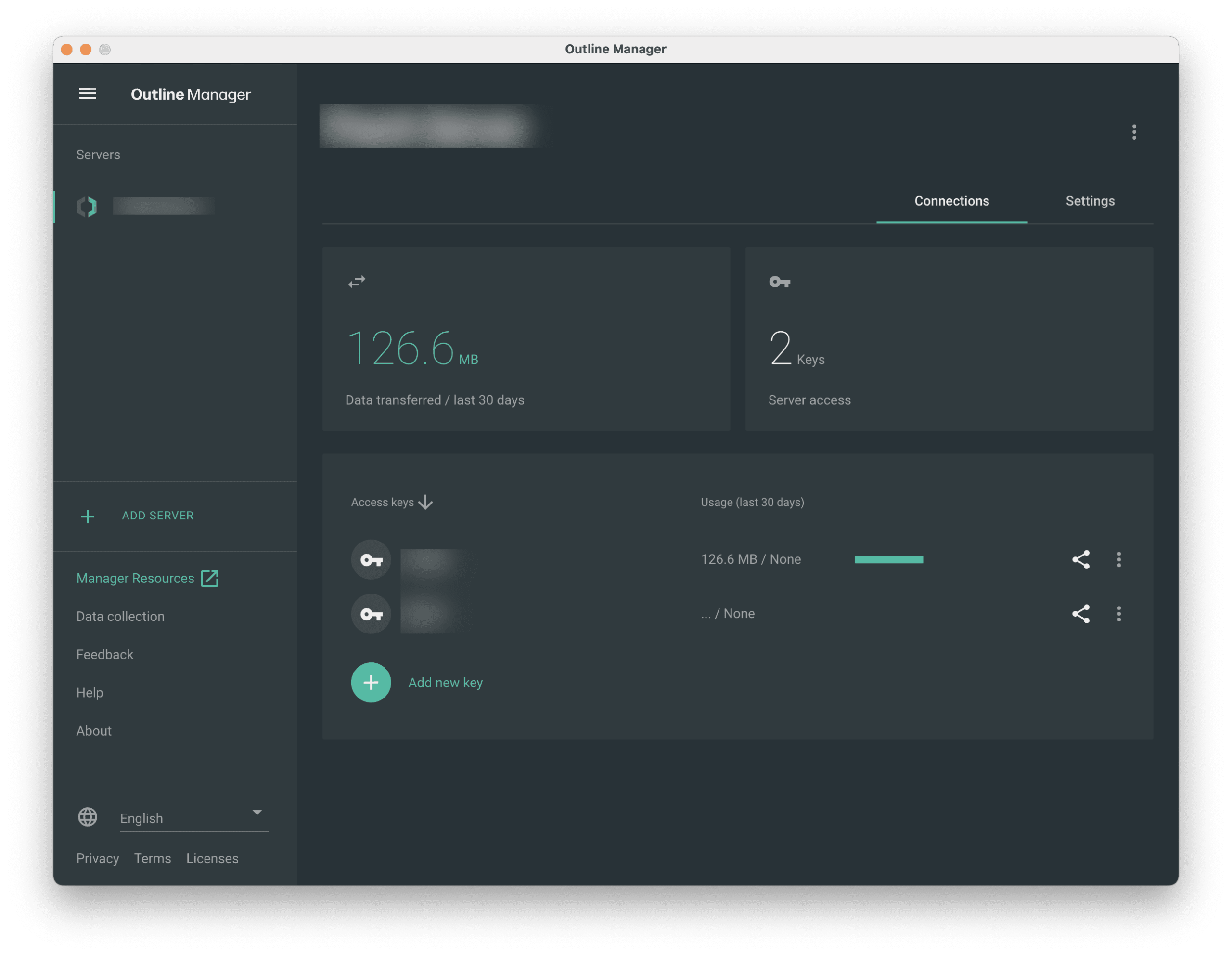 Sau khi kết nối xong, bạn có thể tiến hành quản lý key truy cập hoặc xem thống kê băng thông đang sử dụng trên máy chủ VPN.