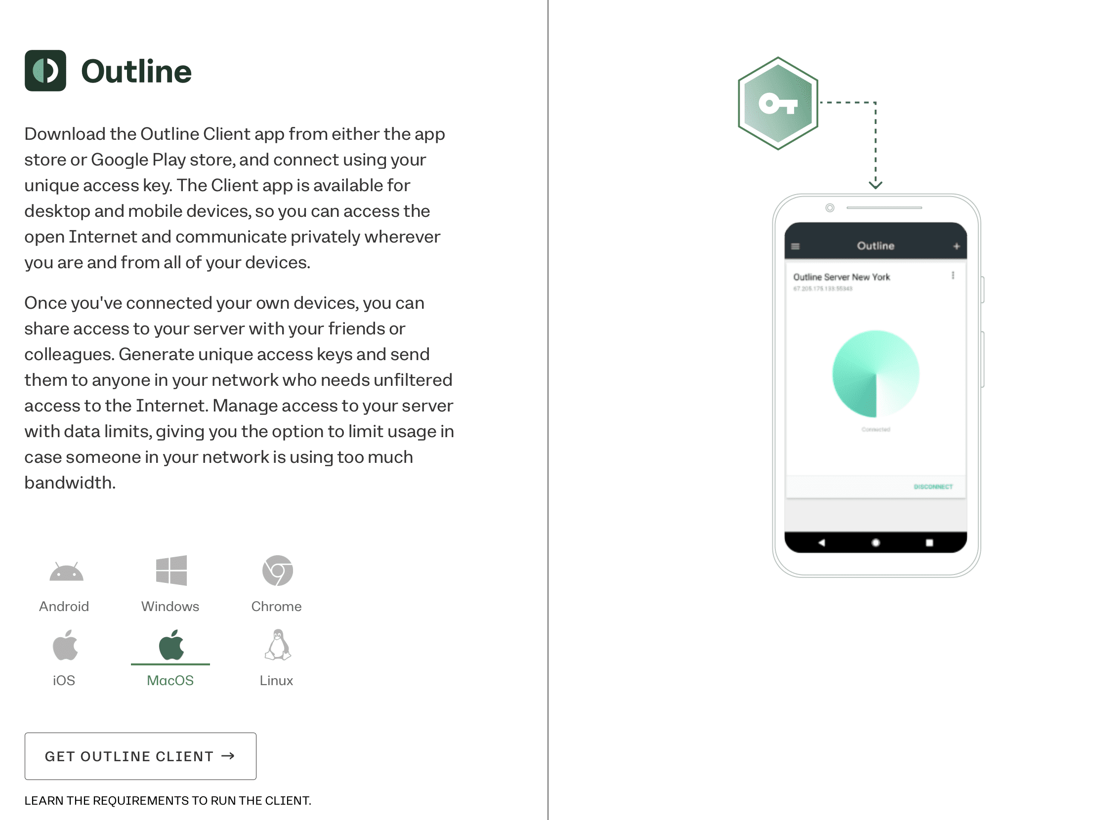 Sau khi người dùng đã có khoá truy cập, thì sẽ cần tải phần mềm Outline Client dành cho thiết bị cần kết nối vào, hiện tại nó đã hỗ trợ gần như tất cả các hệ điều hành phổ biến hiện nay như Windows, macOS, Android, iOS và Linux.