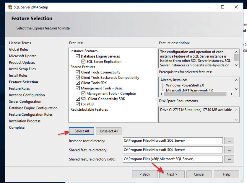 Chọn các tính năng bạn muốn cài đặt. Chắc chắn rằng “Database Engine Services” được chọn để cài đặt máy chủ SQL. Ở đây mình sẽ cài tất cả .