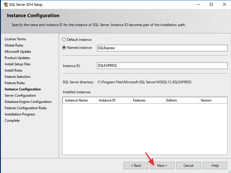 Trong trường hợp không thiếu những file cài đặt, bỏ qua những bước cập nhật trên, tiến trình cài đặt sẽ chuyển thẳng sang hộp thoại Instance Configuration như bên dưới, ở đây bạn có thể đặt tên cho phiên bản cài đặt hoặc để tên mặc định và chọn Next.