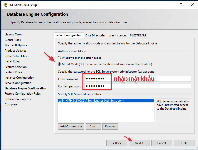 Chọn “Windows authentication mode” hoặc “Mixed mode” tùy thuộc vào yêu cầu bảo mật của bạn. Nếu chọn Mixed mode, bạn cần nhập mật khẩu cho tài khoản sa. Tốt nhất là chọn Mixed Mode thì bạn cần điền mật khẩu và cần nhớ mật khẩu này và chọn Next.