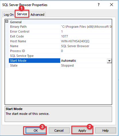 Trong tab Service, thiết lập chế độ Automatic cho Start Mode.
