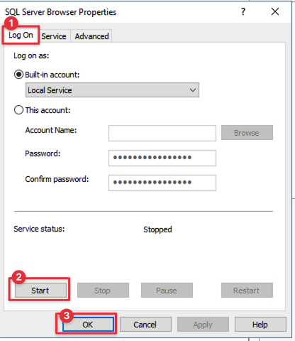 Chuyển sang tab Log On, chọn Start để khởi động.
