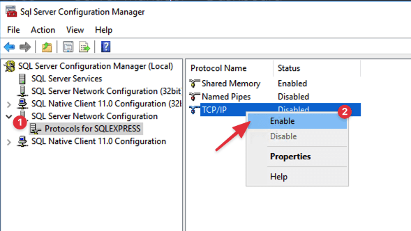 Tiếp theo, ở tab SQL Server Network Configuration, chọn tab Protocols for SQLEXPRESS đặt trạng thái Enable cho TCP/IP nhằm cho phép thiết bị khác kết nối vào Microsoft SQL Server thông qua IP.