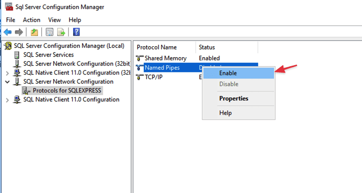 Và cũng đặt trạng thái Enable cho Named Pipes để cho phép thiết bị khác kết nối vào SQL Service thông qua tên của máy chủ.