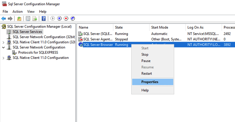 Quay lại SQL Server Services, nhấn phải chuột vào SQL Server Browser, chọn Properties.
