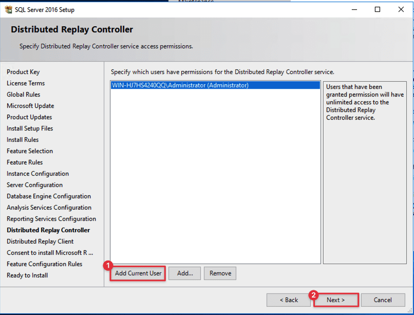 Ở đây cũng vậy , bạn bấm vào [ Add Current User ] để thêm user quản lý, sau đó bấm [ Next ] để tiếp tục.