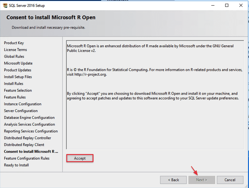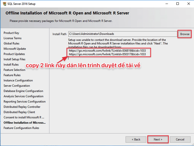 Tới đây bạn cần cài bổ sung các thư viện này của Microsoft bằng cách truy cập vào 2 link mà SQL Server 2016 hiện lên, sau khi cài bạn chọn đường dẫn tới thư mục vừa tải 2 file .cab đó về.
